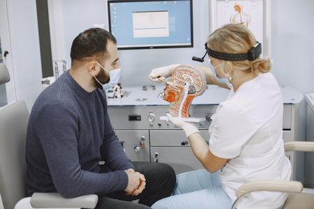 Education in the anatomy of ENT organs. The doctor explains the anatomy of the mucous membrane of the nose and throat using a model.