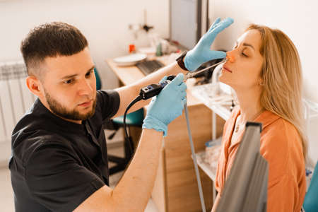Nose endoscopy. Rhinoscopy procedure with rhinoscope. ENT doctor otolaryngologist with headlight treat nose woman patient