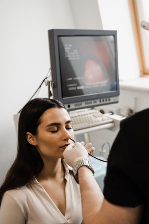 Side view of a professional otolaryngologist using a laparoscope and checking the nose of a young woman with respiratory problems
