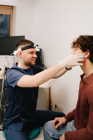 An experienced male ENT doctor examines a young patient's the throat of a patient with inspection spatula