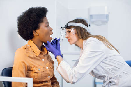 Throat and larynx diseases concept. Young female confident doctor otorhinolaryngologist examines patients throat in modern light office. African lady at appointment at ent doctor