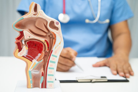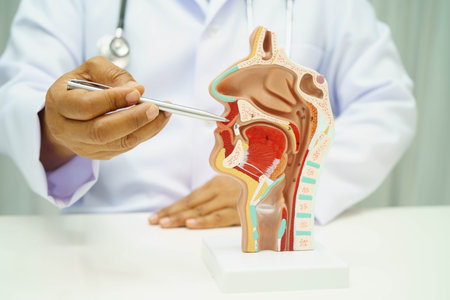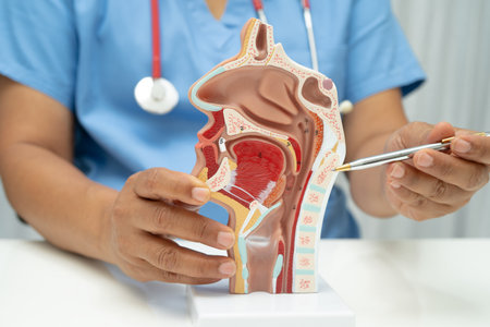 Asian doctor with nasal oral throat cavity neck human anatomy model for study diagnosis and treatment in hospital.