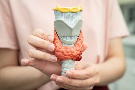 Hyperthyroidism, Overactive Thyroid, Thyroid Lymphoma, Asian woman with thyroid gland human anatomy model.