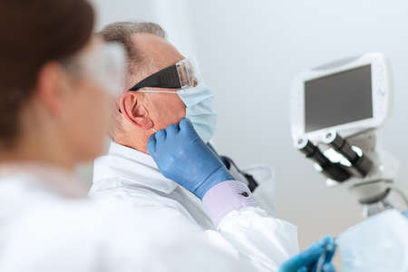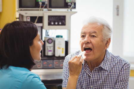 Serious male otolaryngologist in white coat sitting at table and examining throat of sick senior patient in own office