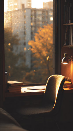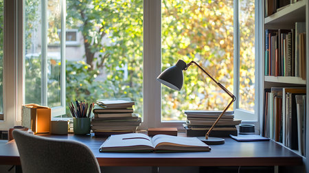 Soft sunlight fills a study area with a desk lamp glowing warmly while autumn leaves shine outside creating a tranquil and inviting atmosphere