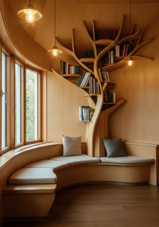 This inviting reading nook features a beautifully crafted tree-shaped bookshelf, seamlessly integrated into the warm wooden interior. The soft seating and natural light create a perfect atmosphere for relaxation and reading