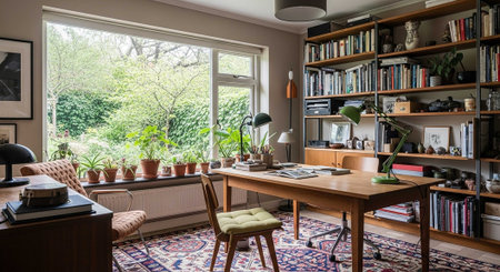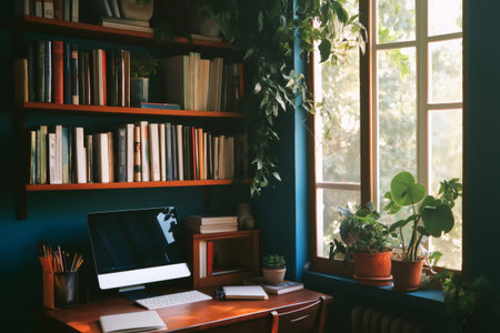 Cozy home office space featuring bookshelves, lush plants, and natural light, creating a tranquil and productive atmosphere