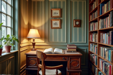 Cozy vintage study room with wooden desk and bookshelves by window. That the image is generated using AI.
