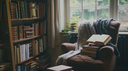 A cozy reading nook with a comfy chair, blanket, and a stack of books.