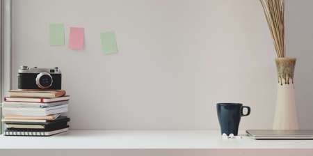 Minimal workspace with copy space and ceramic vase decorations on white table and white wall background