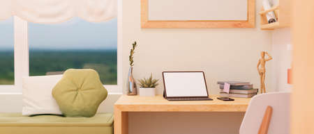 Home office with laptop and book on desk decor white frame as lamp light and house plants with wall loft style interior decorations. close up