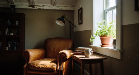A cozy living room with a leather armchair, a wooden side table, books, and a potted plant on the windowsill