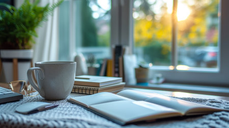 A warm and inviting workspace featuring a laptop, coffee mug, and a small plant by the window, capturing a peaceful moment of productivity and inspiration.