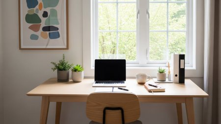 An interior shot showcases a clean workspace with a laptop on a wooden desk. The scene includes an abstract artwork, potted plants, and office supplies near a window. The composition utilizes natural lighting to create a bright atmosphere. Suitable for use in articles, websites, and promotional materials related to work environments.