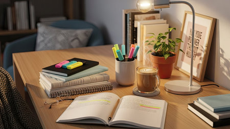 A well-lit home office desk scene features books, a small plant, and a cup of coffee. Warm overhead lighting illuminates the composition, highlighting the textures of paper and wood. This image may be suitable for illustrating themes such as work from home, education, or creative pursuits.