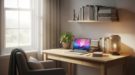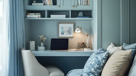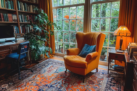 A cozy reading nook with a work desk, books, and a comfy chair, emphasizing relaxation and productivity combined