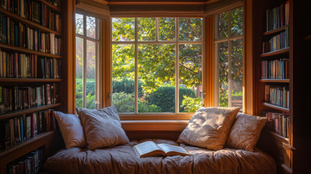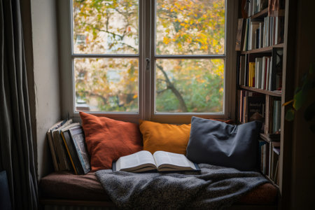 Open book lies on a cozy window seat adorned with colorful cushions, overlooking a tranquil autumnal view, creating a perfect reading nook