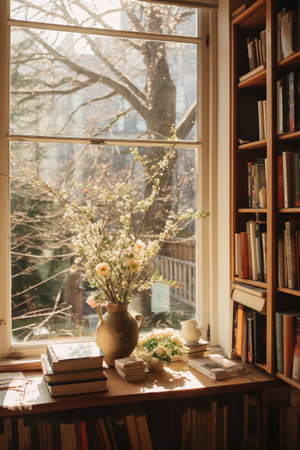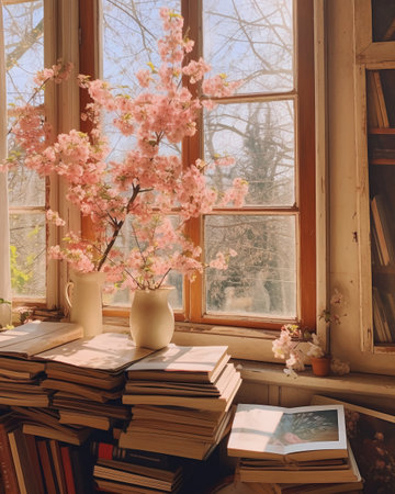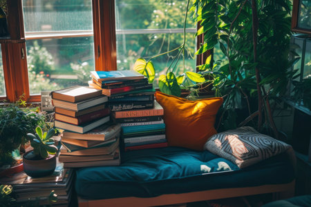 An AI-generated illustration of a cozy window seat adorned with a collection of books