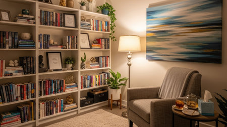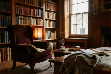 Cozy Home Library with Inviting Reading Nook and Soft Lighting for Relaxation