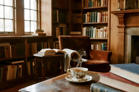 Warm vintage reading nook with a velvet armchair, fireplace, stacked books, hot coffee, and floor-to-ceiling bookshelves in a classic wooden library interior.