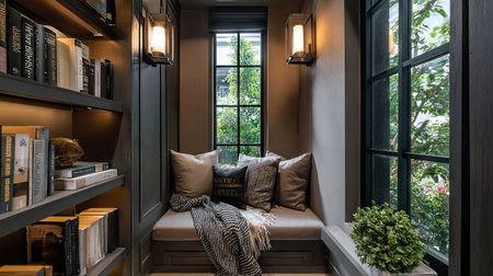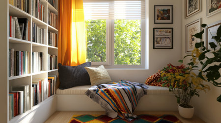 This inviting reading nook features stylish bookshelves, soft cushions, and ample natural light, creating a perfect space for relaxation and inspiration.