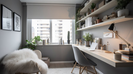 Interior design of Home Office in Scandinavian style with Floating Shelves decorated with Sheepskin Rug, Potted Plants material. Modern architecture. Generative AI AIG24.