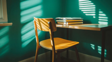 A serene study space featuring a wooden chair and a desk stacked with books, illuminated by soft sunlight casting charming shadows. Ideal for focus and creativity.