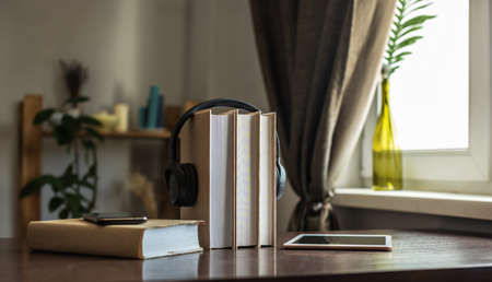 A stack of books with headphones on and tablets on the table. The concept of modern technological education and the study of books.