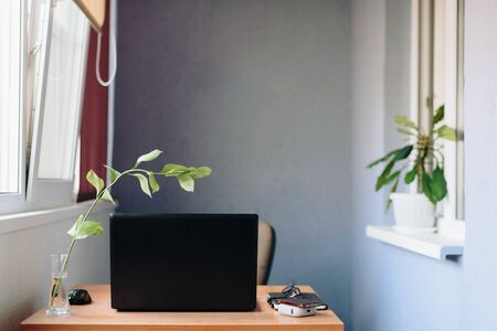 Minimal background image of home office workplace with blank empty laptop on desk, copy space
