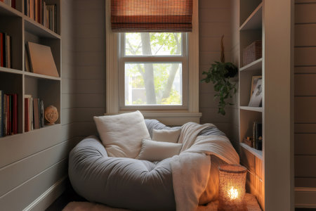 A serene and inviting reading corner featuring a window seat, soft bedding, and bookshelves bathed in natural light by Generative AI.