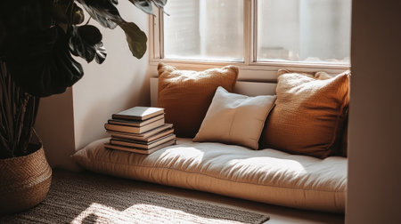 A stylish reading nook with two books stacked neatly, soft pillows all around.