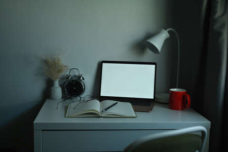 Photo of a comfortable student table surrounded by a white blank screen computer laptop, lamp, alarm, jar, coffee cup, book and eyeglasses.