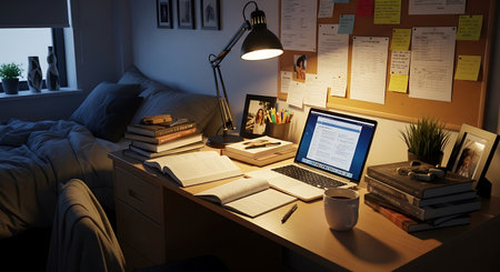A cozy study space features an open book and a laptop on a cluttered wooden desk, surrounded by shelves filled with books, notes, and stationery.
