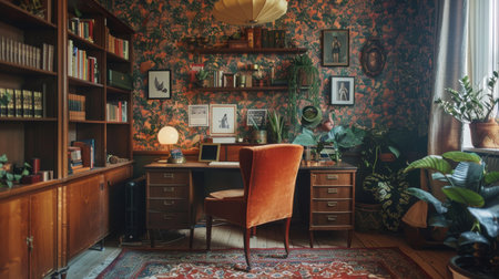 Cozy modern work cabinet with a vintage vibe. Antique desk, velvet chair, patterned wallpaper, and warm lighting. Vintage decor, bookshelves, and potted plants.