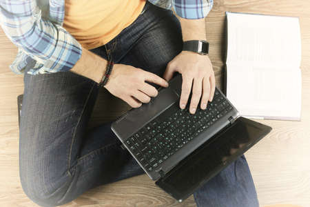 Modern workspace at home. Young man working with a laptop on the wooden floor. Top view