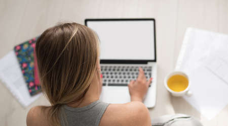 Top view of female hands working with laptop on office desk with smartphone, tablet and office supplies