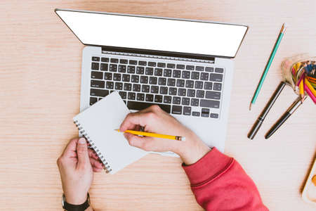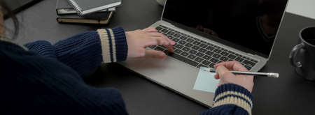 Cropped shot of businesswoman writing an idea on notepad while looking information on laptop