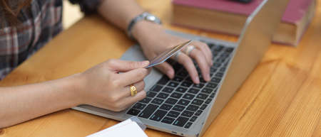 close up woman hand using credit card shopping online on mobile app on wood table at home