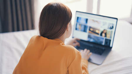 Woman professional freelance content writer keyboarding on laptop computer while resting in coffee shop. Female entrepreneur having online training course via portable notebook. Using web page