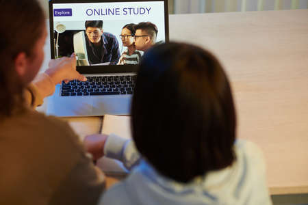 Young Asia teen girl student distance learning lesson with online teacher and study on laptop screen in living room at home night.