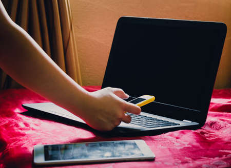 Shopping online on laptop computer at home in the evening, paying credit card bill