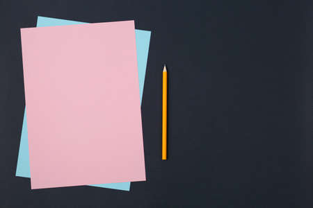 Top close up shot of a pencil with white papers shot over black background in basic education concept