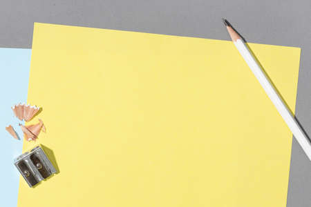 Blank yellow sheet paper, white pencil and sharpener on gray Background. Creative Mock up template flat lay desk