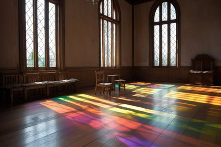 sunlight through stained glass creating rainbow spectrum on floor, created with generative ai