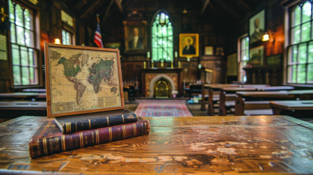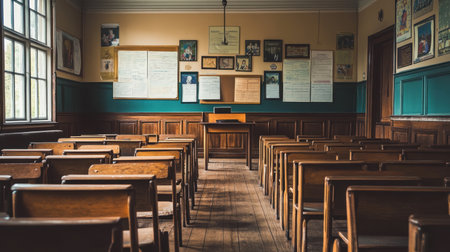 A beautiful vintage classroom showcasing wooden desks and decorative walls filled with historic documents, evoking a sense of nostalgia and traditional education.