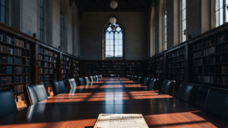 A serene library environment featuring wooden tables, an open book on the central table, and soft natural light enhancing the peaceful reading atmosphere.