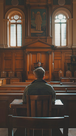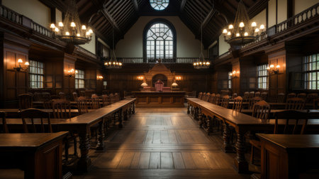 This historical vintage courtroom showcases an elegant design with ornate wood detailing, high ceilings, and traditional furniture, evoking a profound sense of justice and authority.