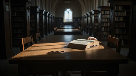 A single open book rests on a wooden desk in an empty library, bathed in the warm glow of sunlight streaming through windows.