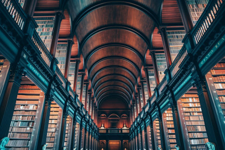 Explore the magnificent ornate ceiling in this grand library, showcasing intricate woodwork and captivating design, creating a tranquil atmosphere for knowledge seekers.