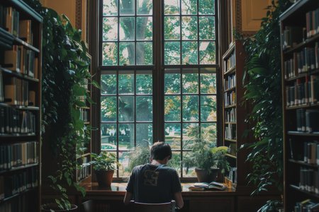 A person standing by a window in a library, surrounded by books, A quiet library corner with a student deep in concentration